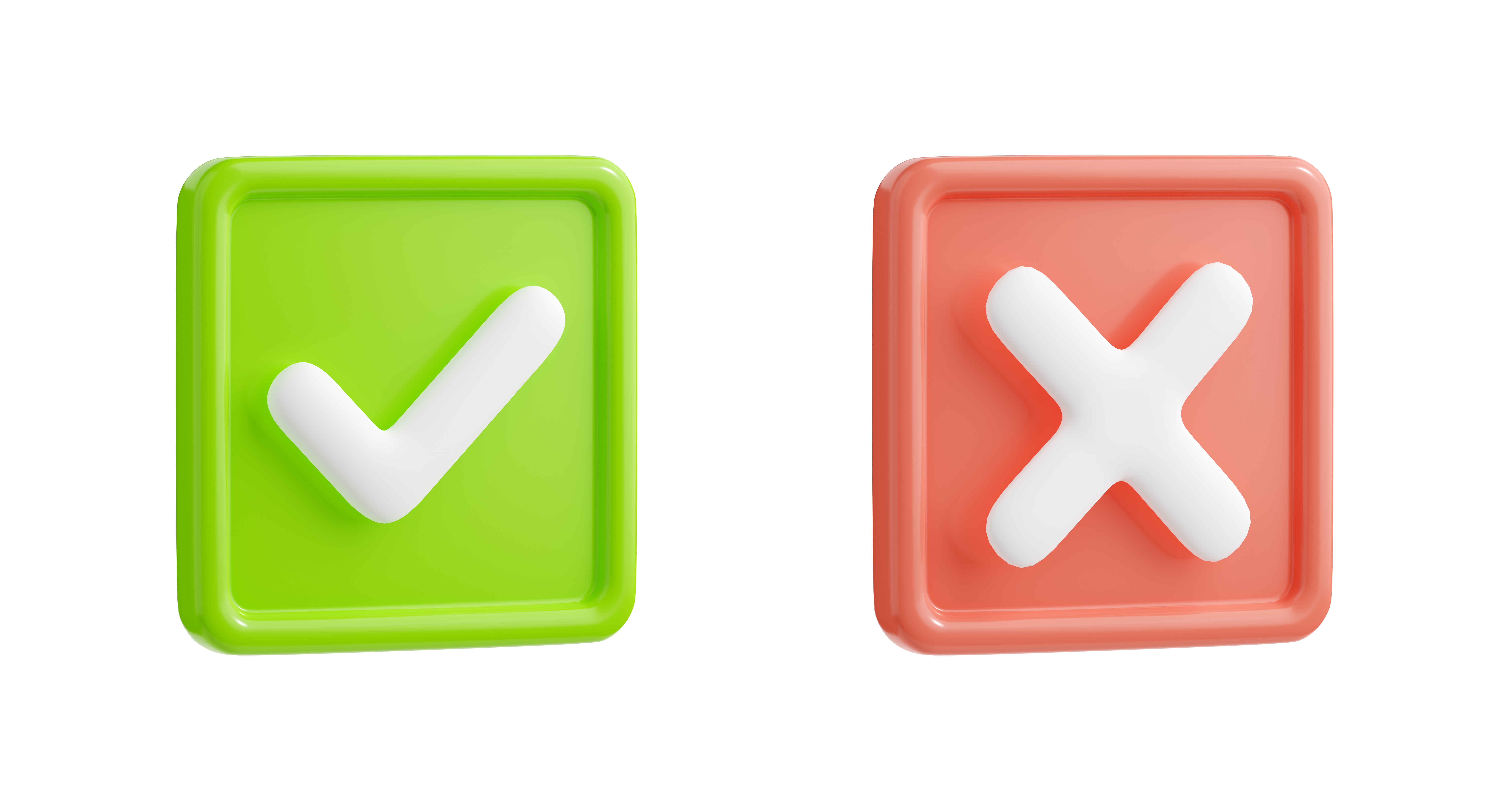 Check marks with tick and cross sign for icons of right and wrong choice. Red and green square buttons with symbols of correct, confirm, cancel and denied, 3d render illustration