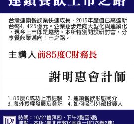 10/27《连锁餐饮上市之路》专题研讨会 This entry was posted on 2016-10-03 您好 近年来,餐饮行业快速成长,使餐饮业朝连锁与大型化发展,并加入推动股票上市柜 […]